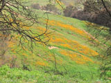 After about twenty minutes we left the developed area and almost instantly a hill covered with wildflowers suddenly came into view. Unfortunately, we didn’t have our camera but made mental notes to take it tomorrow and, for a change, take a “do-over” hike just for a picture. The terrain we were on was quite barren, but somewhat level, and eventually started leading downhill. The decomposed granite was rather large and acted like ball bearings under our feet. Amber, as well as I, seemed to have trouble maintaining footing. At the bottom of the hill, we crossed a creek lined with trees and at once found ourselves on Old Coach Trail a little north of the point on Old Coach Trail where we turned around yesterday. Our question of how far Lomas Verdes trail extended was pleasantly answered.